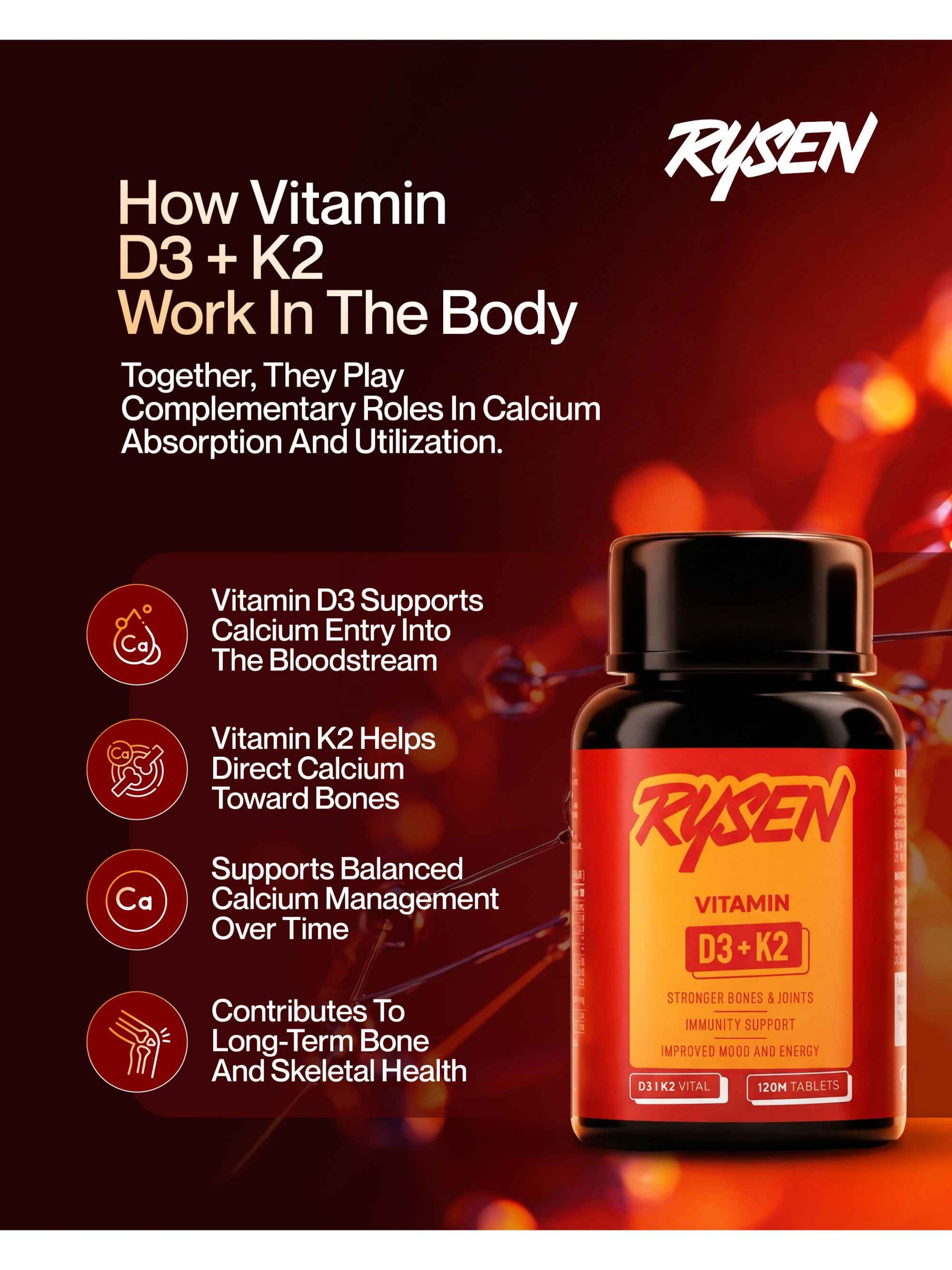 Rysen Vitamin D3 + K2 Tablets – Daily Bone Nutrition Supplement (120 Tablets)